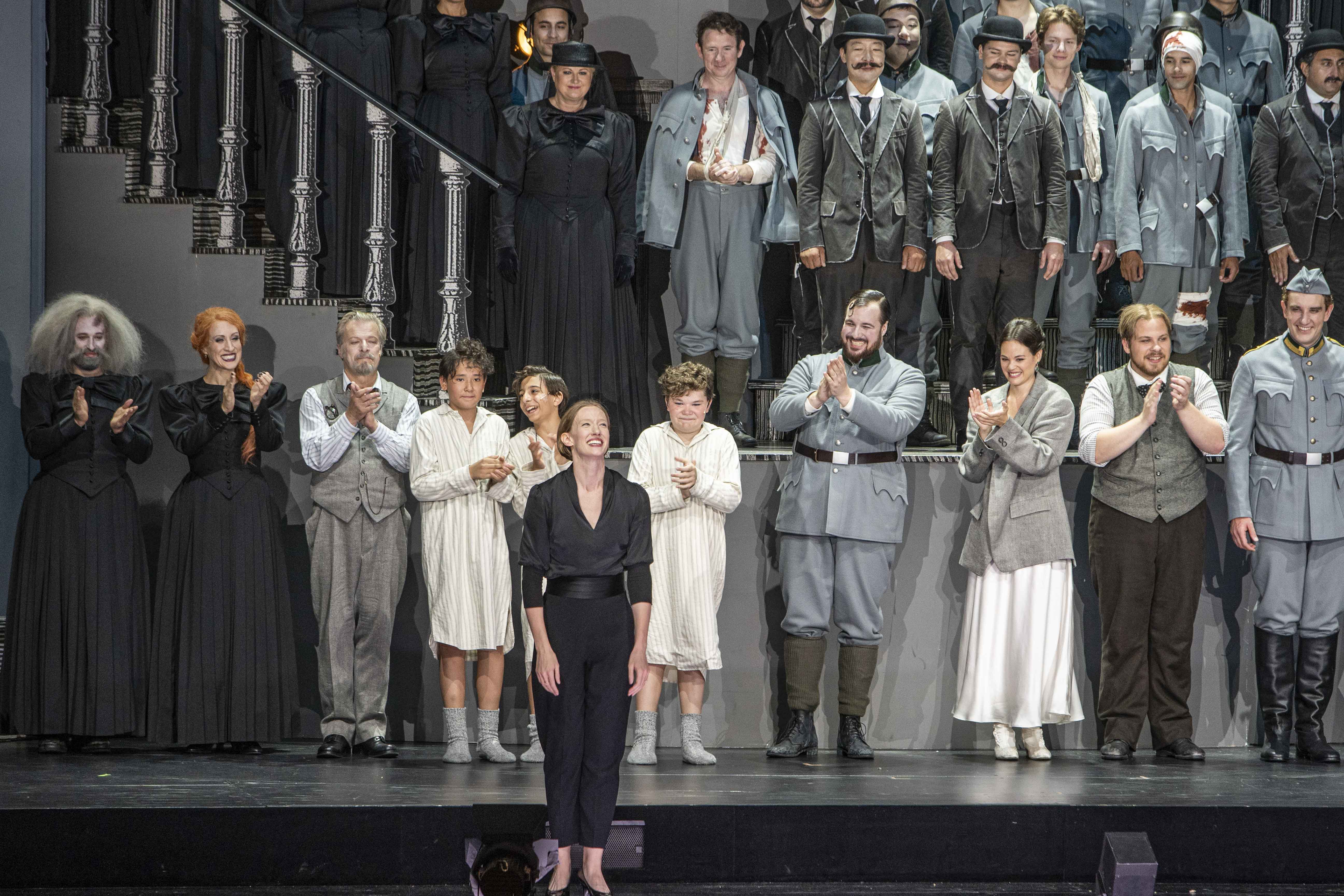 Die Zauberflöte final applause 2022: Stefan Vitu (Cook / Old Papagena), Maria Nazarova (Papagena), Peter Tantsits (Monostatos), Brenda Rae (Queen of the Night), Roland Koch (Grandfather), Wiener Sängerknaben (Three Boys), Mauro Peter (Tamino), Regula Mühlemann (Pamina), Michael Nagl (Papageno), Tareq Nazmi (Sarastro), Noa Beinart (Third Lady), Sophie Rennert (Second Lady), Ilse Eerens (First Lady), Simon Bode (Second Priest / First Man in Armour), Henning von Schulman (Speaker / First Priest / Second Man in Armour), Valérie Junker (Third Priest), Concert Association of the Vienna State Opera Chorus, Angelika-Prokopp-Sommerakademie der Wiener Philharmoniker (Stage Music)