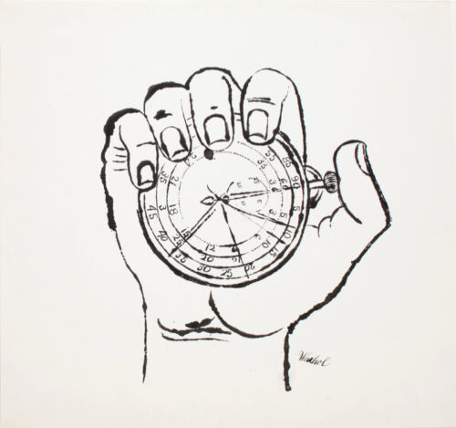 Andy Warhol, Hand Holding Stop Watch, c. 1955, ink on Strathmore paper (50.2 x 54 cm; 1998.1.1153) The Andy Warhol Museum, Pittsburgh; Founding Collection, Contribution The Andy Warhol Foundation for the Visual Arts, Inc. © The Andy Warhol Foundation for the Visual Arts, Inc. / Bildrecht Wien, 2025