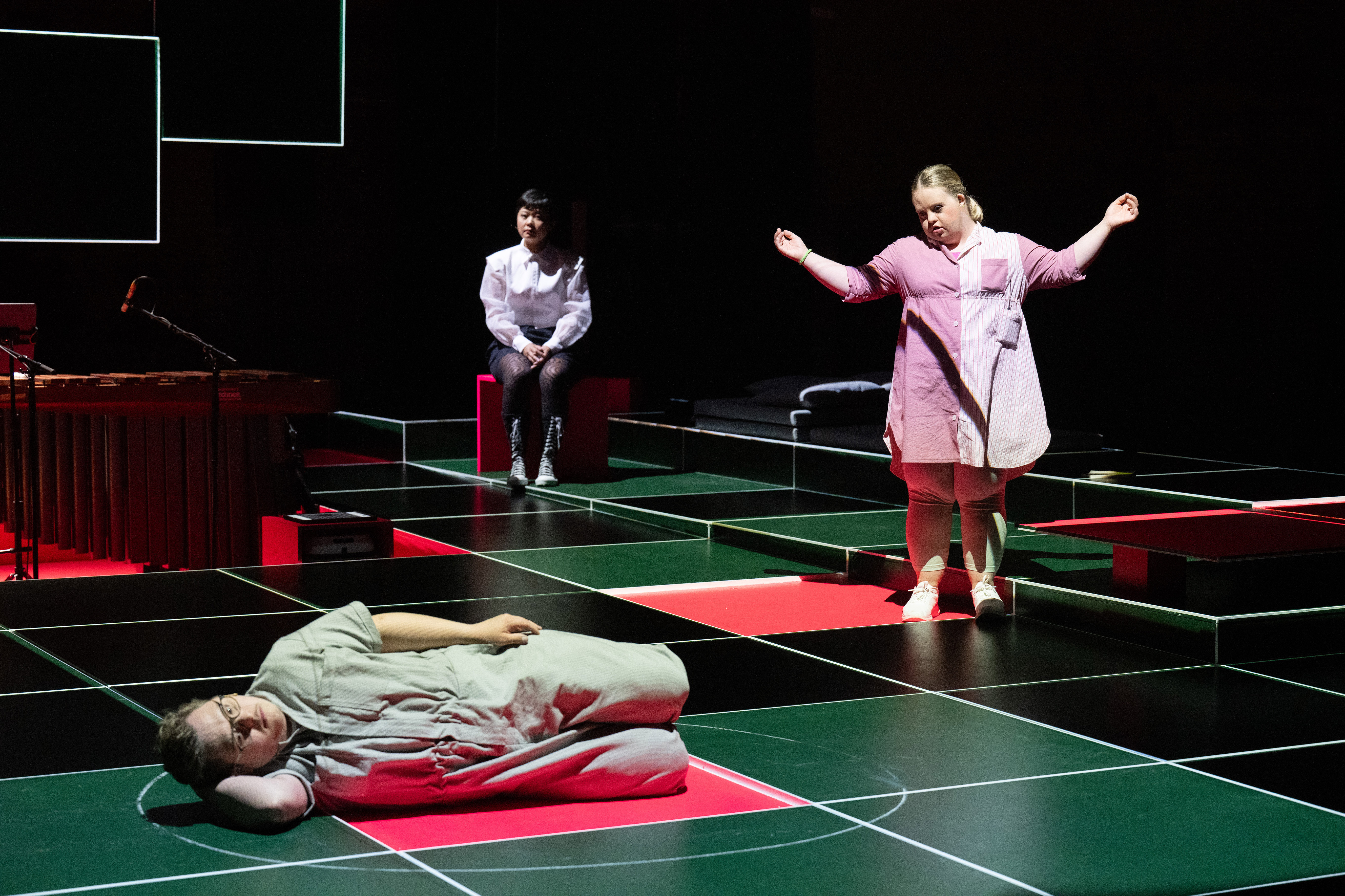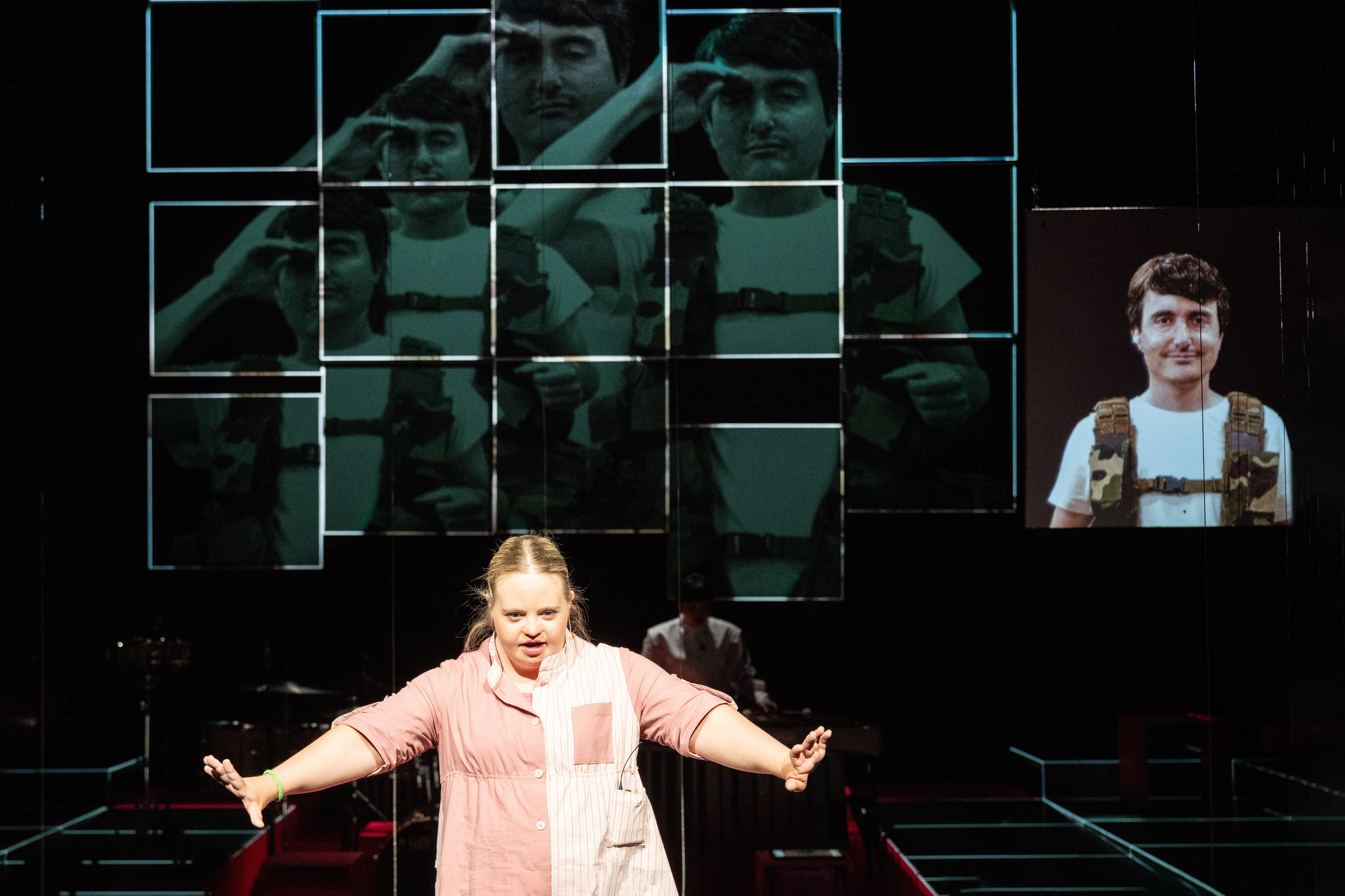 Schlussapplaus Der kaukasische Kreidekreis 2023: Marc Jungreithmeier (Video und Licht), Barbara Morgenstern (Komposition), Helgard Haug (Konzept und Regie), Remo Beuggert, Simone Gisler, Robin Gilly, Tiziana Pagliaro, Minhye Ko (Live-Musik), Christine Ruynat (Kostüme), Rozenn Lièvre (Sounddesign), Ensemble