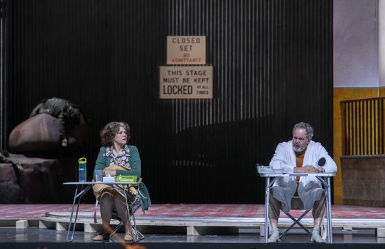 Schlussapplaus Premiere Falstaff 2023: Liliana Benini (Robinia), Joaquin Abella (First Assistant Director), Marc Bodnar (Orson W.), Cecilia Molinari (Mrs. Meg Page), Bogdan Volkov (Fenton), Simon Keenlyside (Ford), Elena Stikhina (Mrs. Alice Ford), Ingo Metzmacher (Musikalische Leitung), Gerald Finley (Sir John Falstaff), Christoph Marthaler (Regie), Anna Viebrock (Bühne und Kostüme), Joachim Rathke (Mitarbeit Regie), Malte Ubenauf (Dramaturgie), Lasha Iashvili (Mitarbeit Kostüm), Sebastian Alphons (Licht), Giulia Semenzato (Nannetta), Tanja Ariane Baumgartner (Mrs. Quickly), Michael Colvin (Bardolfo), Jens Larsen (Pistola), Thomas Ebenstein (Dr. Cajus), Huw Rhys James (Choreinstudierung), Konzertvereinigung Wiener Staatsopernchor