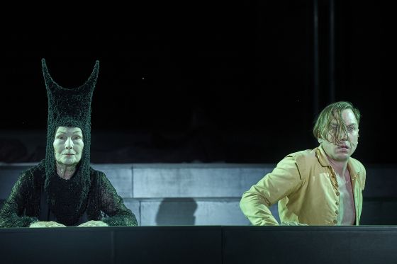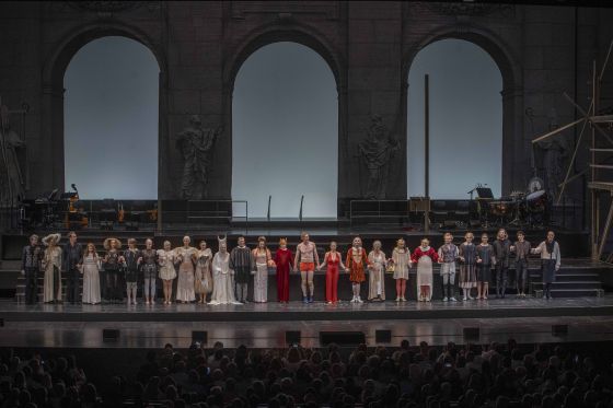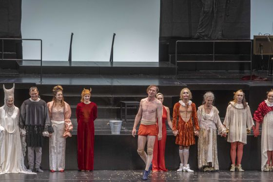 Dernière Jedermann Schlussapplaus 2022: Edith Clever (Tod), Jörg Ratjen (Ein armer Nachbar), Anna Rieser (Des Schuldknechts Weib), Mavie Hörbiger (Gott / Teufel), Lars Eidinger (Jedermann), Verena Altenberger (Buhlschaft), Mirco Kreibich (Ein Schuldknecht / Mammon), Angela Winkler (Jedermanns Mutter), Tino Hillebrand (Dünner Vetter), Gustav Peter Wöhler (Dicker Vetter)
