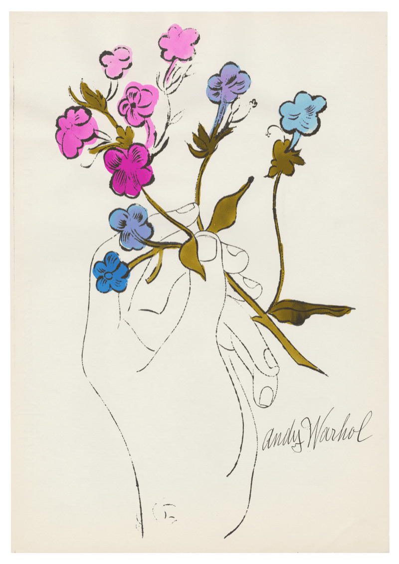Andy Warhol, Hand and Flowers, 1957, offset lithograph and watercolor on paper (36.2 x 25.4 cm; 2000.2.1354)