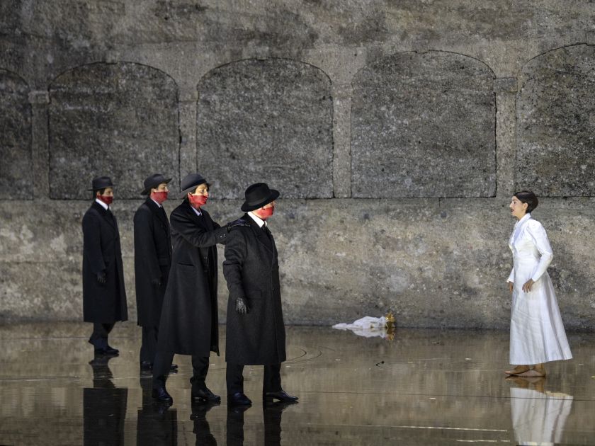 Der italienische Regisseur Romeo Castellucci, ein profunder Erforscher der Kraft des Sehens, verstanden auch als das, wovon wir gesehen werden, ergründet die Verborgenheiten dieser „Tragödie des Blickes“. Als Künstler, der über eine außergewöhnliche Fähigkeit verfügt, Bilder hervorzubringen, in denen das Wissen des Unbewussten pulsiert, nähert er sich Salome, indem er den Schauplatz des theatralen Geschehens als Ausgangspunkt nimmt. Durch einen Eingriff in das klassische Bild der Felsenreitschule mit ihren aus dem Gestein des Mönchsbergs gehauenen Arkaden wird der Eindruck des Erstickens suggeriert. Man könnte ihn als objektives Korrelat zu dem Gefühl von Bedrängung betrachten, das die Protagonistin von allen Seiten umgibt und das auch durch die Musik vermittelt wird. Das Gestein spiegelt sich auf einer goldenen Fläche wider, einem Universum, das im Glanz eines orientalischen Königreichs erstrahlt und in pompösem Prunk den Rahmen für eine ebenso mächtige wie ohnmächtige Welt abgibt — die Welt des Herodes. Diese ist stets im Begriff zu agieren, jedoch niemals in der Lage, eine Aktion, einen Akt, zu Ende zu bringen und wirklich Gestalt anzunehmen.