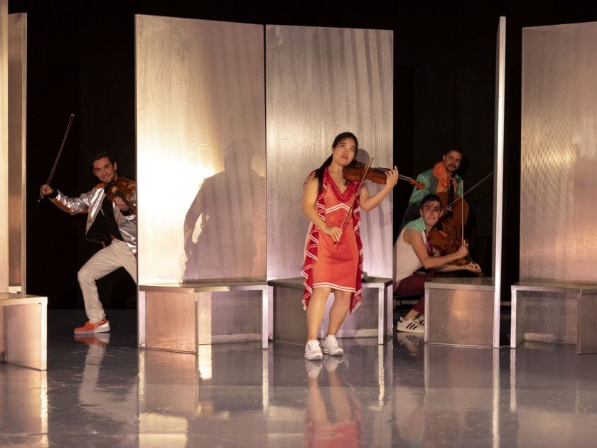 Streichquartett — da denkt man doch gleich: Sitzfleisch. In diesem Konzert aber gibt es viel Bewegung, denn die vier Streicher sind nicht sesshaft. Sie kommen aus der Türkei, Japan, Brasilien, Frankreich und erzählen die Geschichten ihrer Musik ohne Stühle, ohne Worte, aber mit viel Bewegung und Humor. Wenn dabei manchmal schräg gestrichen wird, ist das kein Zufall, sondern der Wunsch, in allen Lebenslagen Musik zu machen. Die niederländische Gruppe Oorkaan entwickelt ausgehend von der Musik des Quartetts ein Konzert der besonderen Art.